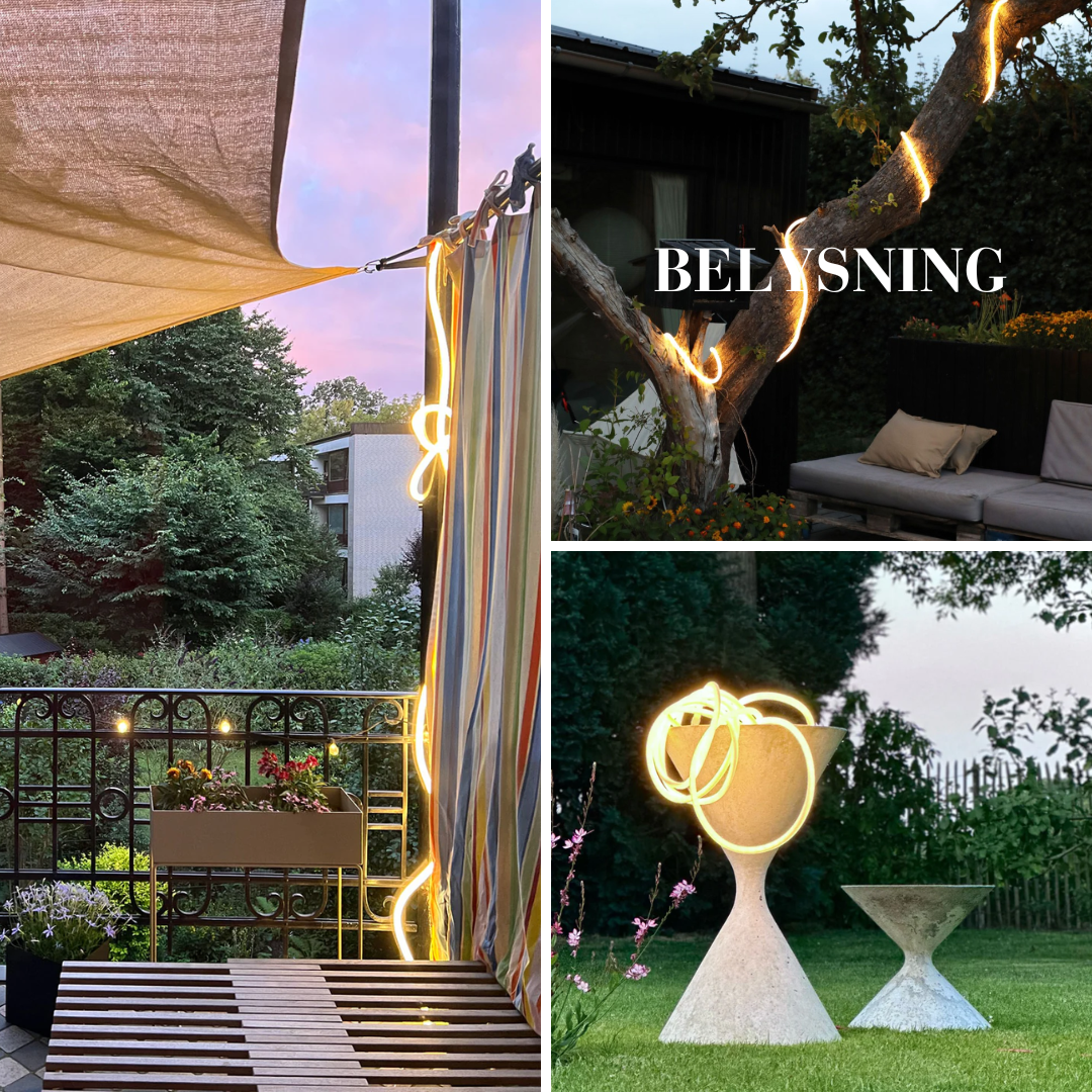 Det rette lys gør en verden til forskel! FLEX TUBE fra Studio About er en vandafvisende LED-lampe, der kan bruges i overdækkede uderum. Hæng den op i et hjørne, slyng den om en gren, eller læg den på et bord for at skabe en blød, stemningsfuld glød – perfekt til lange forårsaftener. Generelt kan man skabe en masse stemning, ved at tilføje fint lys i sit uderum.