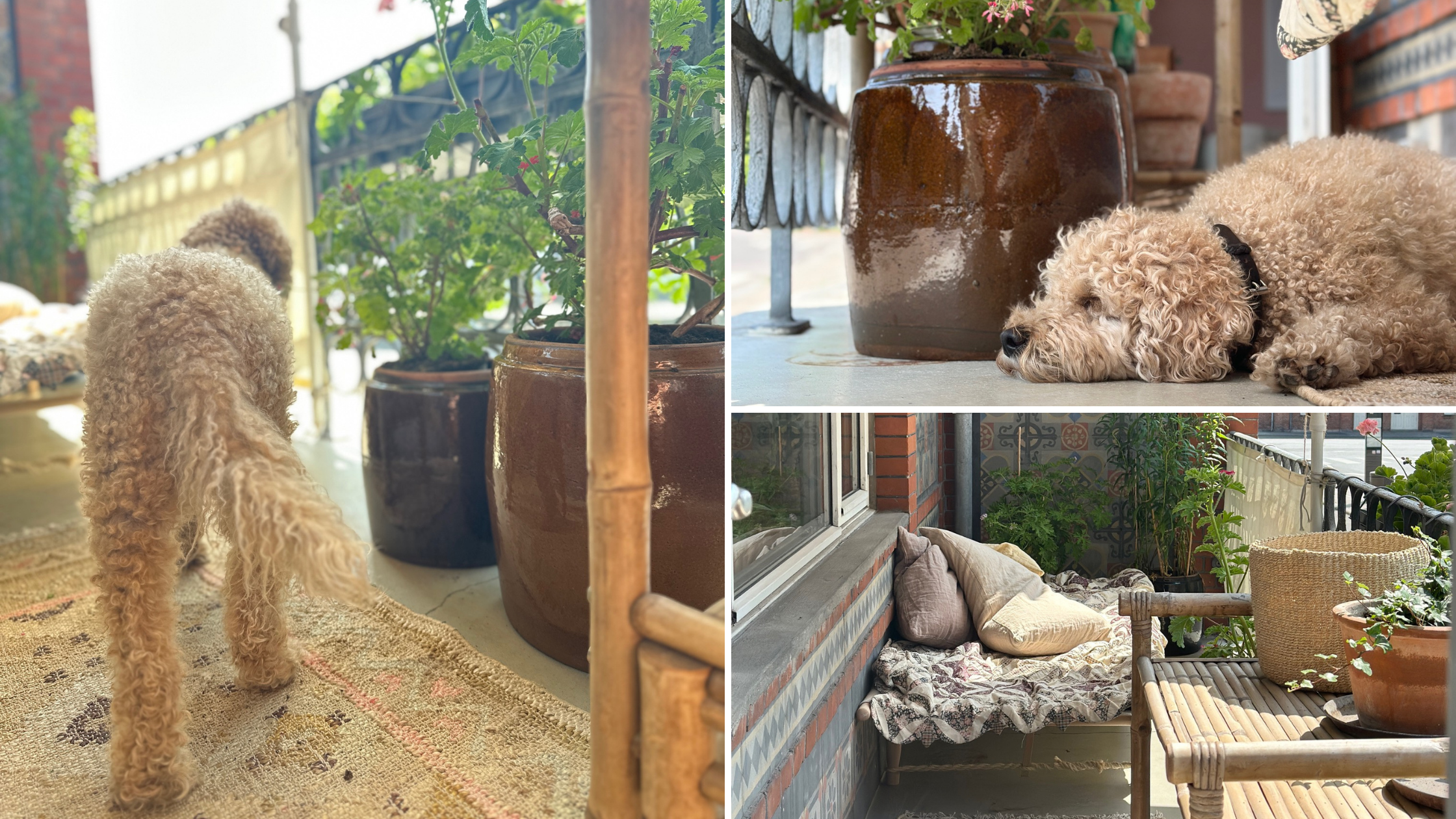 På billederne ser du glimt fra Trines altan. Enkle møbler, varme toner og naturlige materialer, der skaber en rolig stemning midt i byen. Det behøver ikke være stort for at være rart – det handler om nærvær, luft og noget grønt omkring sig.