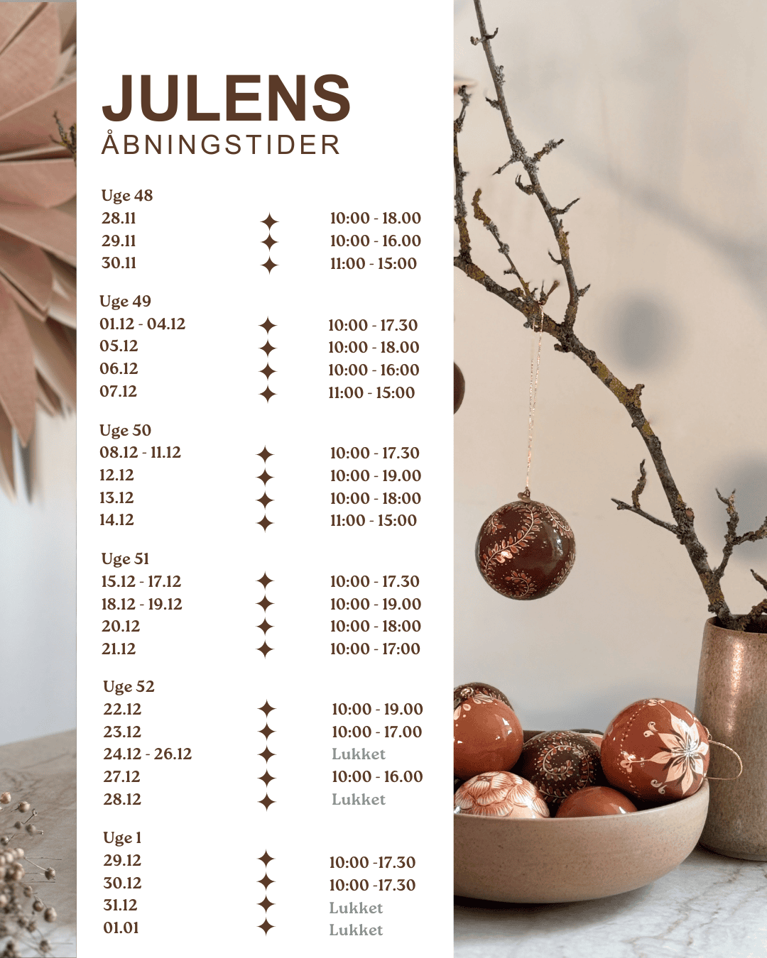 I Balsalen udvider vi åbningstiderne i den fysiske butik i julen. På billedet kan du se, hvordan butikken holder åbent henover julen 2025.