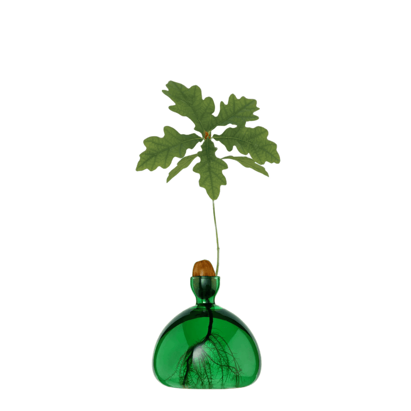 Denne runde vase fra ILEX STUDIO i farven Emerald Green er lavet specifikt til at spire agern i. Du er med til at se et simpelt agern, du har plukket, vokse sig til et stort og fint træ, som du senere kan plante.