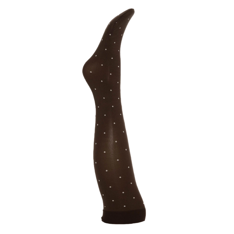 Denne variant af de prikkede knæstrømper kombinerer en mørkebrun bund med fine off white prikker, som giver et legende, men stadig sofistikeret udtryk. Farvesammensætningen tilfører varme og karakter til outfittet og gør strøperne nemme at style – både til neutrale farver og mere markante looks.