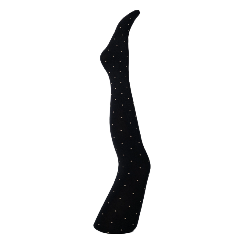 Denne variant af de prikkede strømpebukser kombinerer en sort bund med fine beige prikker, som giver et legende, men stadig sofistikeret udtryk. Farvesammensætningen tilfører varme og karakter til outfittet og gør strømpebukserne nemme at style – både til neutrale farver og mere markante looks.