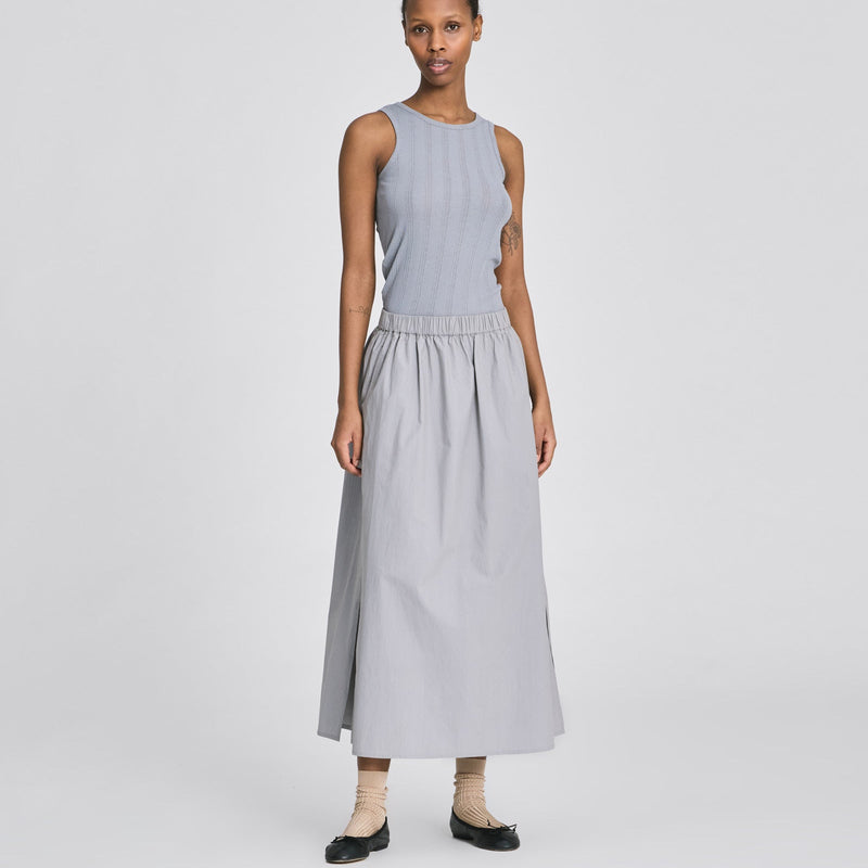 Alice Skirt er en lang nederdel fremstillet i 100% økologisk bomuldspoplin – et let og sprødt materiale, der giver et elegant og luftigt udtryk. Nederdelen har en let A-formet silhuet, som falder flot og giver en afslappet, feminin pasform.