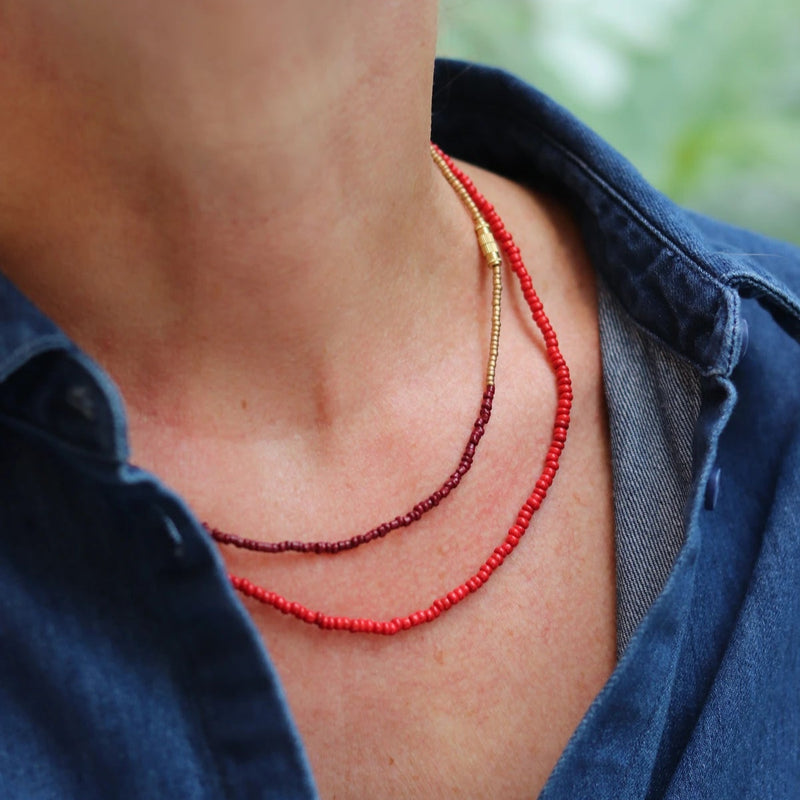 ANA er en lille, delikat halskæde med to farver, der spiller fint sammen i et minimalistisk design. Den er lavet af fine glasperler og afsluttes med en enkel messinglås. Halskæden er håndlavet i Indien og passer perfekt både alene og som en del af et lag-på-lag look.