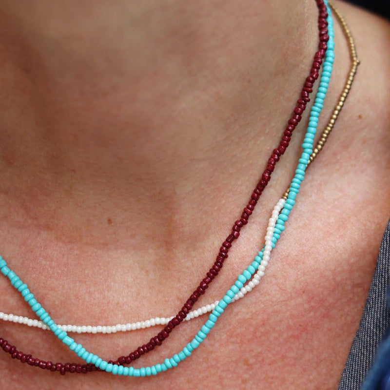 ANA er en lille, delikat halskæde med to farver, der spiller fint sammen i et minimalistisk design. Den er lavet af fine glasperler og afsluttes med en enkel messinglås. Halskæden er håndlavet i Indien og passer perfekt både alene og som en del af et lag-på-lag look.