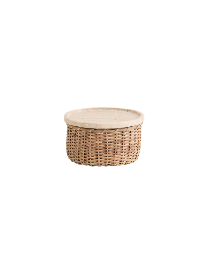 ARICA opbevaringskrukke med travertin låg - en minimalistisk og charmerende krukke, der kombinerer det bedste fra naturens materialer. Det håndflettede design giver et varmt udtryk, mens låget i travertin tilføjer et elegant og ekslusivt touch. Fin til opbevaring af små genstande, hvor ønsket er organisering, men samtidig kan gøres med stil.