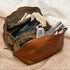 Toilettasken har en indvendig åben lomme, to indvendige lommer med lynlås og en hank.