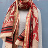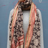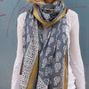 Smukt og let bomuldstørklæde med guldkanter håndlavet i Indien. Trykt med den traditionelle indiske trykke-teknik Bagru fra Rajasthan, hvor udskårne træklodser dyppes i farve og presset mod stoffet.
