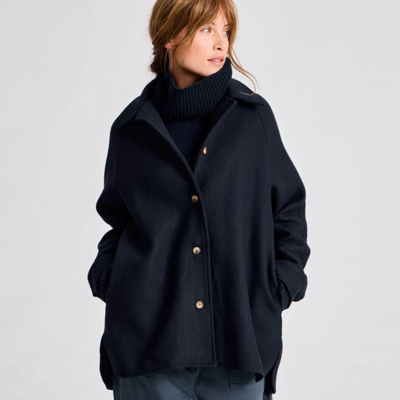 Bitten er nemlig en let jakke med knapper, der kan lukkes, lavet af 50% genbrugsuld, 40% polyester og 10% polyamid. Jakken har hornknapper foran og ved ærmerne. Jakken har et moderne og tidsløst design med sit lige snit, knapper og den lige oversized pasform.