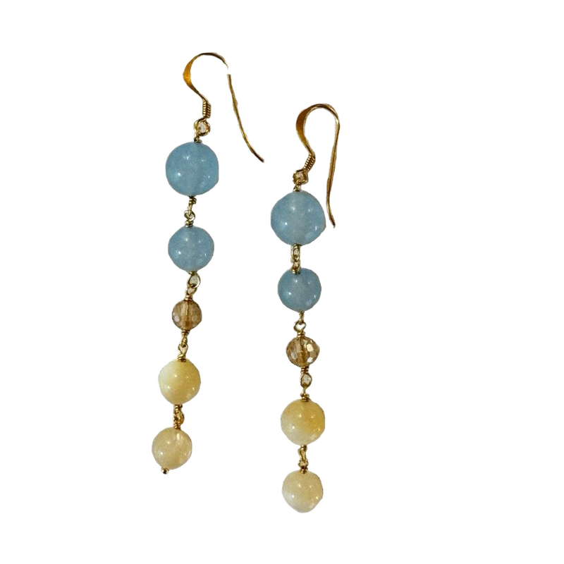 Det aflange design skaber en smuk bevægelse, når øreringene bæres. Kombinationen af de kølige blå perler og de varme elementer skaber en harmonisk balance, der gør dem nemme at style til både hverdag og særlige anledninger.