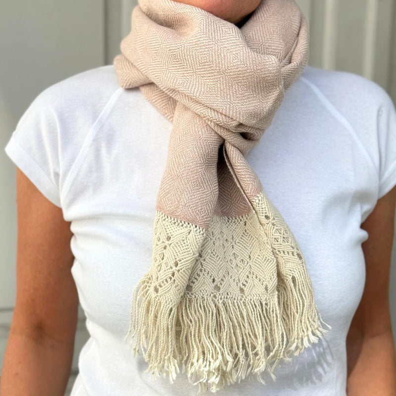 Dette fine tørklæde er vævet af én mand i Bolivia, som er den dygtigeste væver! Når han har vævet tørklæderne sendes de videre til de traditionelle højlandskvinder i Bolivia, som herefter afslutter tørklædet med sit særlige macramé-mønster. Tørklæderne laves i samarbejde med Mia fra Chola, og på den måde kan du være sikker på, at de er lavet under forsvarlige forhold, da det er Fairtrade.