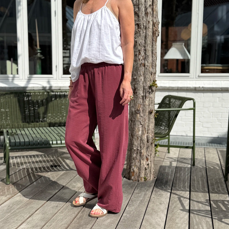 Cayenne bukserne er nogle dejlige løse, afslappede og bredde bukser, som har vidde i benene, og en tynd elastik i taljen samt 2 sidelommer.