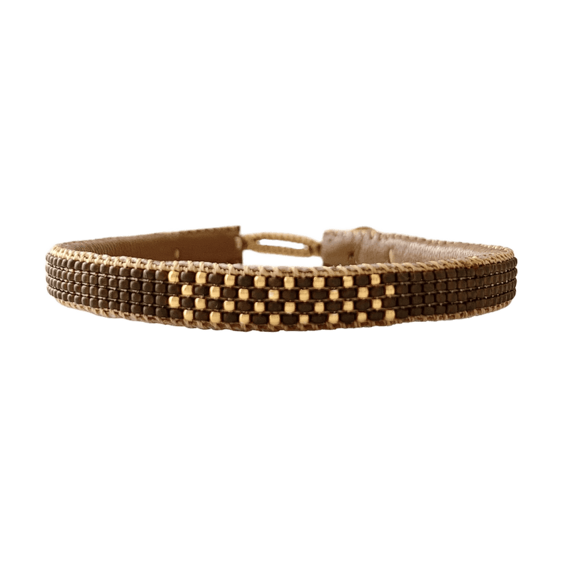 Classic Pin armbåndet fra IBU Jewels er et fint perlearmbånd med en farve som base, hvor nogle små guld perler på midten danner et fint ternet mønster. Armbåndet er lavet af eksklusive Miyuki-perler, som er håndsyet på blødt læder.