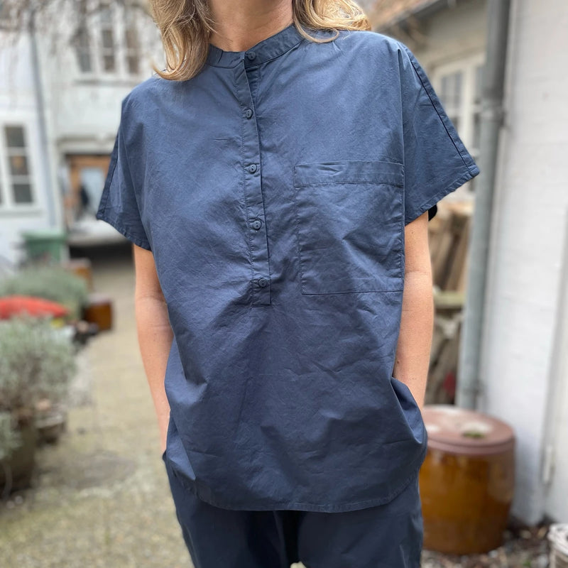 Skjorten har stolpelukning, og er lavet i en let bomuldspoplin, som gør skjorten åndbar og super behagelig at have på. Modellen er one size, som gør den vil sidde forskelligt fra person til person, men passer størrelser fra 34-44.