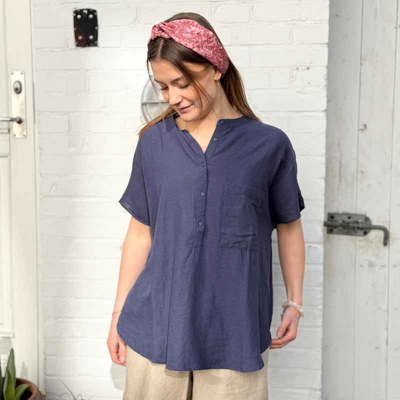 Den kortærmede skjorte 'Colombo' fra Frau har et flot minimalistisk snit med kinakrave med stolpelukning. Modellen er onesize, som gør den vil sidde forskelligt fra person til person, men passer størrelser fra 34-44.