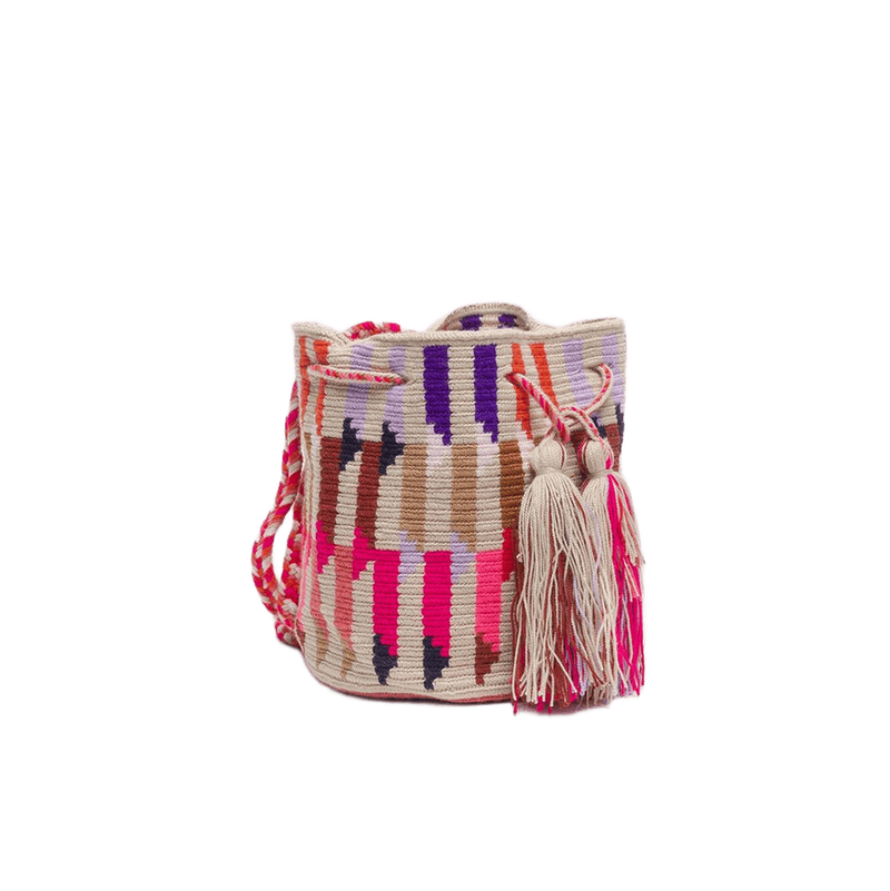 Denne lille crossbody har et bohemeinspireret udtryk med sine levende farver og unikke mønstre. Tasken er designet i Madrid og håndhæklet af kvindelige Wayuu-håndværkere i Colombia. Da hver taske er lavet i hånden, kan der forekomme små variationer i størrelse og mønster – en del af charmen ved ægte håndværk.