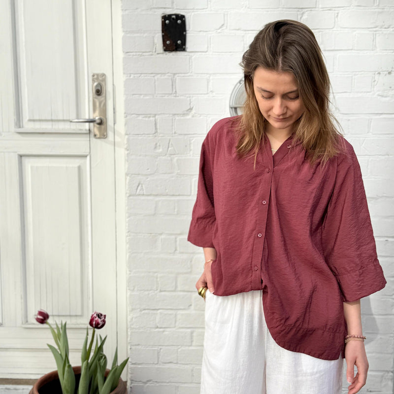 Dubai skjorten er løs, gennemknappet og har kinakrave. Skjorten har rynke detalje foran på skulderskæringen og på rygskæringen.