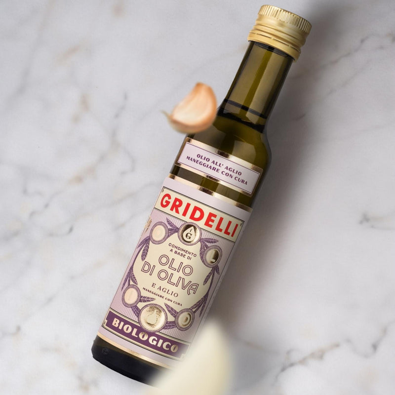 Ingredienser: Koldpresset olivenolie af høj kvalitet, udvundet direkte fra oliven og udelukkende ved mekaniske processer. Fra olivensorterne Ottobratica* og Carolea* 94%, hvidløg* 6%. * Økologisk ingrediens. Opbevaring: Opbevares mørkt og køligt, ikke over stuetemperatur og med låget lukket. Genbrug: Genbruges som glasemballage. Kork som metal. Oprindelsesland: Italien.