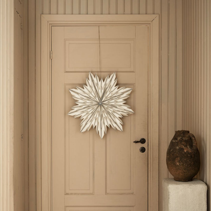 Elsa stjernen fra svenske Watt & Veke er en af de designs, man forelsker sig i ved første blik. De håndfoldede papirstjerner har en unik lethed og elegance, der skaber en rolig og stemningsfuld atmosfære – uanset om de hænger som julestjerne eller som et dekorativt element året rundt. Den offwhite farve med sølvdetaljer giver et diskret spil i papiret, og når lyset rammer, fremhæves de fine folder på smukkeste vis.