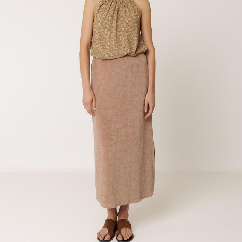 Nederdelen har et langt, flydende fald, som skaber en feminin silhuet og et roligt udtryk. Den bløde struktur i stoffet tilfører dybde og karakter til designet og gør nederdelen velegnet både til hverdagsbrug og mere afslappede anledninger.