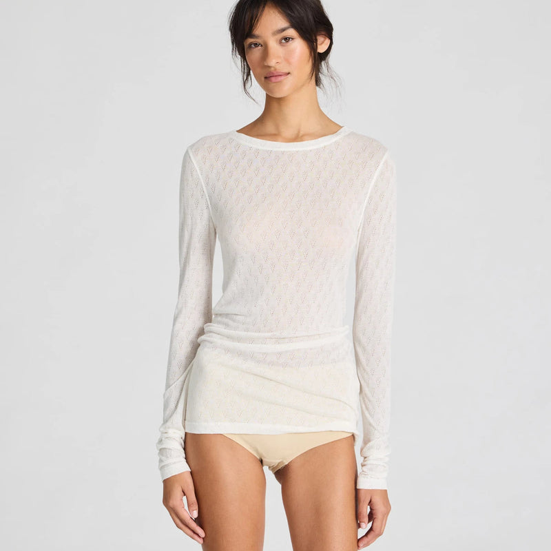 Fermi blusen fra Gai+Lisva er designet med en elegant rund hals, hvor kombinationen af en smuk og let metervarer med et feminint hulmønster fuldender denne fine trøje.