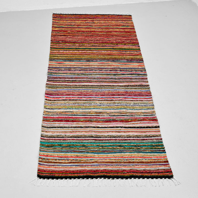 Løberen er vævet i et dekorativt stribet design og kan bruges i gangen eller som et let vægtæppe på væggen. Kombinationen af de genanvendte sarier og den traditionelle væveteknik giver et levende og personligt udtryk, som tilfører varme og karakter til indretningen.