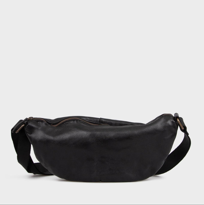 Florence er en sort crossbody taske - fin hverdagstaske fra MONTANA med form som en banan, og som snildt fungerer som en bumbag! Tasken har en justerbar skulderrem og YKK lynlås lukning. Tasken har en udvendig lynlås lomme på bagside, en indvendig lynlås lomme og to indvendige åbne lommer.