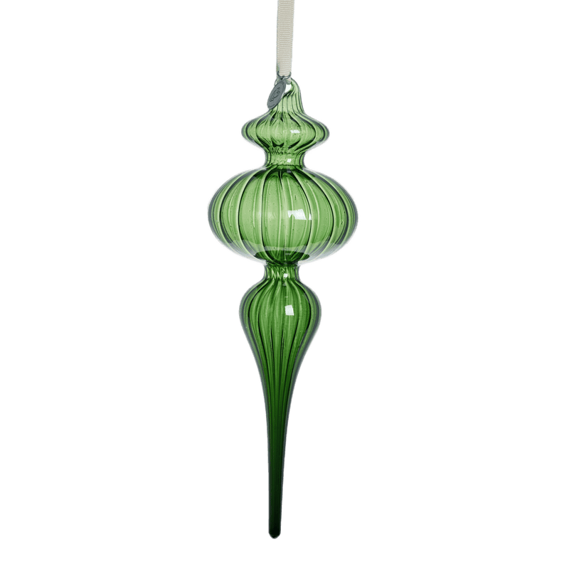Skab et iøjnefaldende og raffineret udtryk på juletræet med dette glasornament i grønt glas fra Lene Bjerre. Ornamentet har en lang, elegant form med bløde riller, som giver et klassisk og luksuriøst præg.