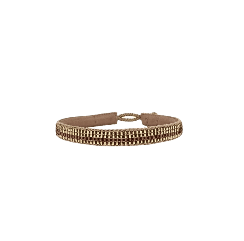 Gold Stripe armbåndet fra IBU Jewels er et elegant håndlavet perlearmbånd med et smukt mønster af guld- og farvede perler. De to rækker af gyldne perler efterfølges af en farverig række, inden armbåndet afsluttes med endnu en guldstribe, der binder designet harmonisk sammen. Armbåndet er fremstillet af eksklusive Miyuki-perler, som er sirligt håndsyet på blødt læder. Brug det alene for et enkelt og raffineret udtryk, eller kombiner det med andre IBU armbånd for et afslappet, bohemeinspireret look.