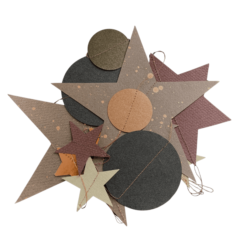 Hver guirlande er skabt af May-Britt Winther med en sikker hånd og sans for detaljer. De fine former sys eller limes fast på en tynd tråd og afsluttes med enten en lille klokke eller en præget cirkel.