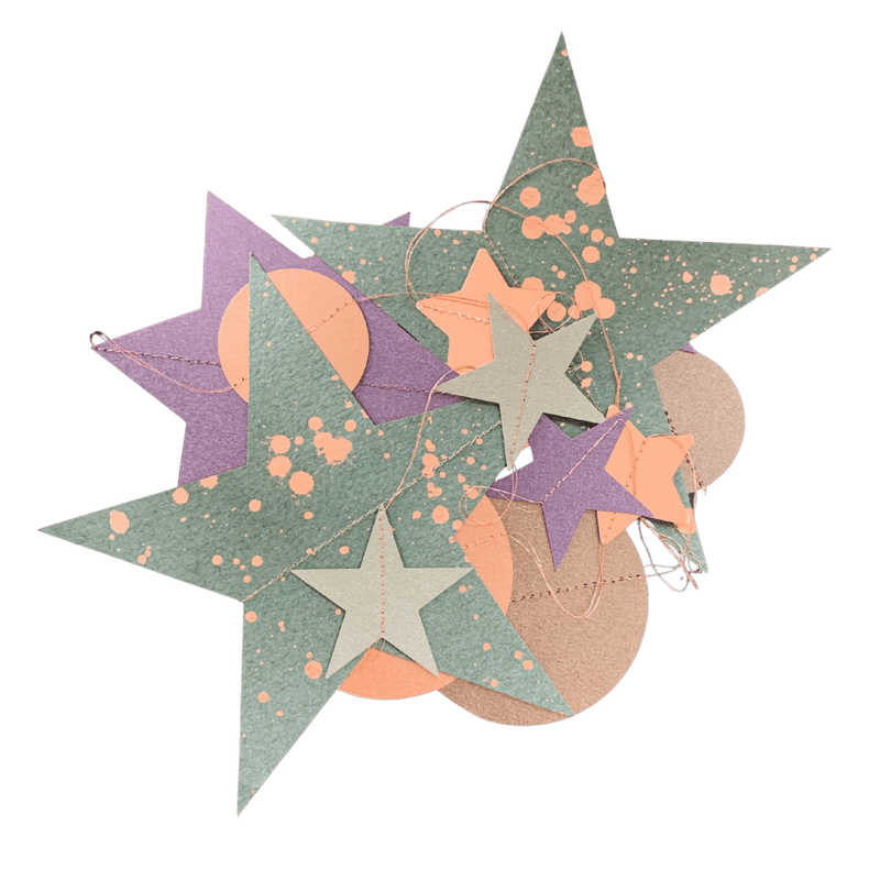 De hænger smukt alene, men endnu bedre sammen med flere – i vinduet, fra loftet eller i dørkarmen. Hver guirlande er håndlavet af May-Britt Winther, der syr eller limer formerne fast med stor præcision.