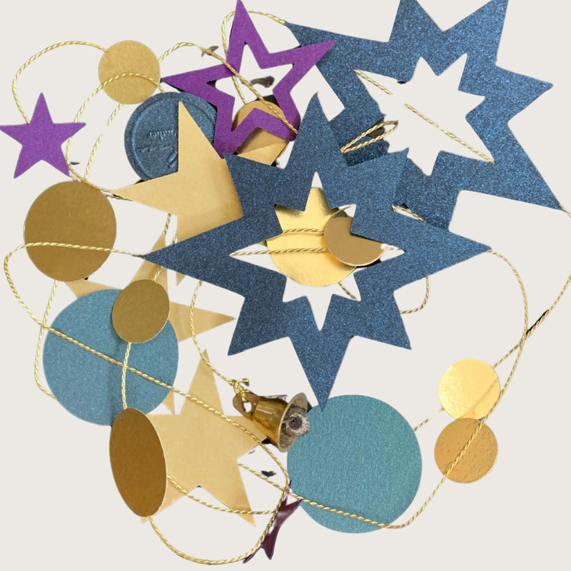 Fyld hjemmet med farver og lethed med May-Britt Winthers guirlander. De håndlavede papirformer hænger i én række og afsluttes med en fin klokke eller præget cirkel.