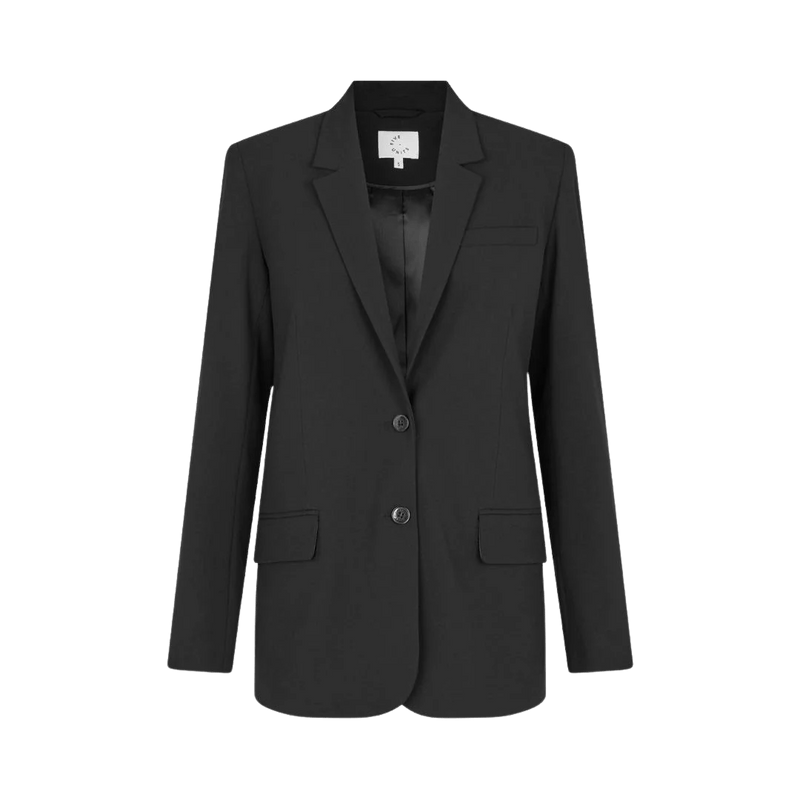 HannahFV er en blazer eller habitjakke - kald det hvad du vil 😉 - til kvinder skåret i en straight fit-silhuet med et enkelt bryst og har minimale detaljer som logoknapper, et skåret revers, en funktionel brystlomme og klaplommer foran. Indsnit i siderne og bløde skulderpuder indrammer kroppen, mens en slids i ryggen sikrer bevægelsesfrihed.