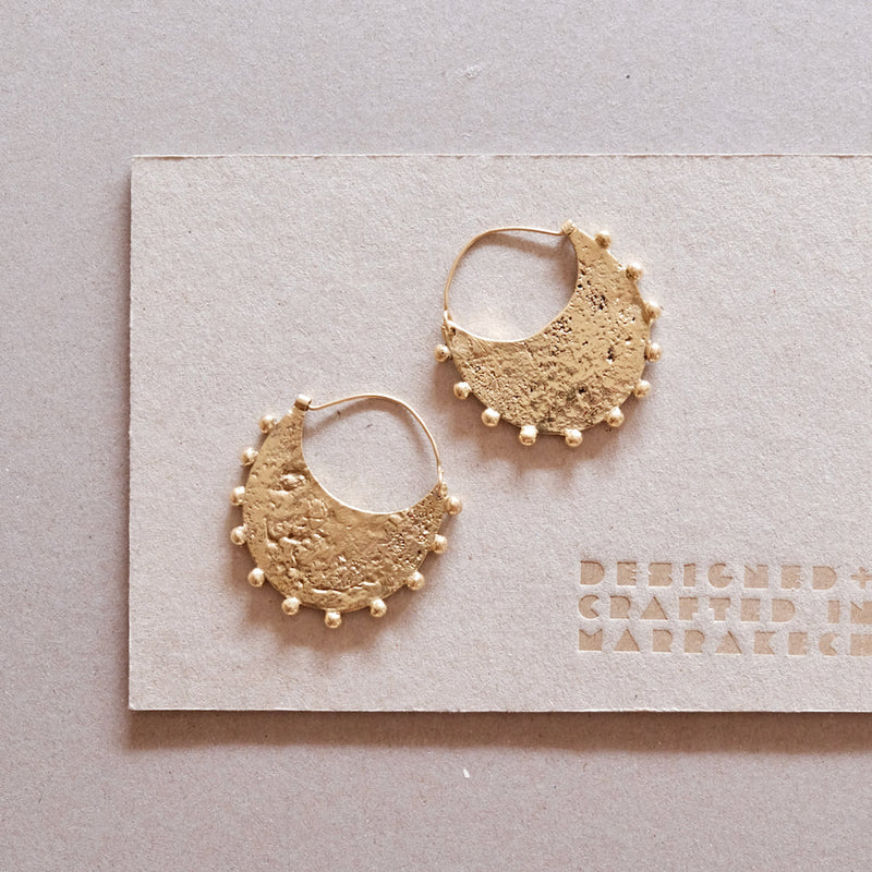 Halvmåneformede øreringe i smeltet messing i Berber-stil med definerende prikdetaljer.