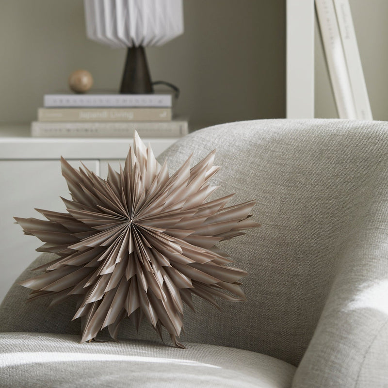 Helena fra Watt & Veke er en af de papirstjerner, man aldrig bliver træt af at se på. Den håndfoldede stjerne har et elegant, luftigt design, der både fungerer som julestjerne og som en dekorativ detalje året rundt. Det enkle udtryk og de fine folder gør den til et blikfang i ethvert rum – uanset om den hænger i vinduet, i et hjørne eller over spisebordet.
