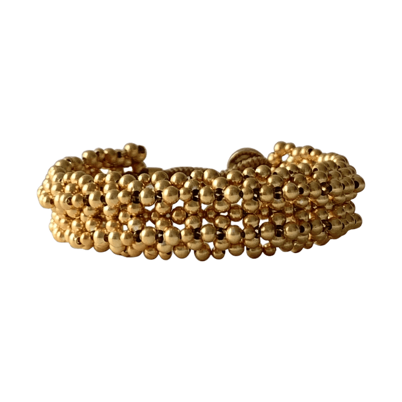 Ibu Bente armbåndet fra IBU Jewels er et stort og chunky perlearmbånd med indviklede deltajer og en masse fine små guldperler sat sammen til ét bredt armbånd. Armbåndet er perfekt til at stable med andre armbånd eller du kan bære det alene.