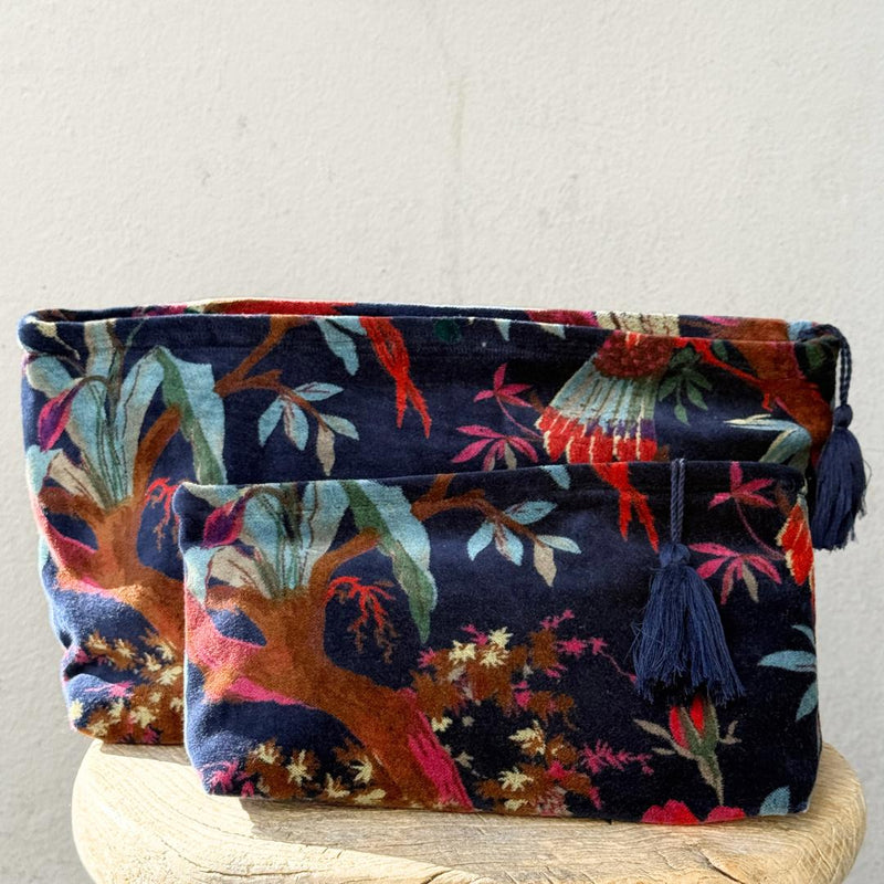 Denne fine toilettaske fra Annavii er håndlavet i Indien af velour med et fint mønster af blomster og fugle. Toilettasken har en fin dusk i lynlåsen og har blot et stort rum.