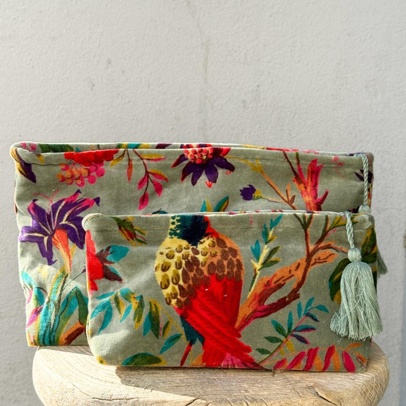 Denne fine toilettaske fra Annavii er håndlavet i Indien af velour med et fint mønster af blomster og fugle. Toilettasken har en fin dusk i lynlåsen og har blot et stort rum.