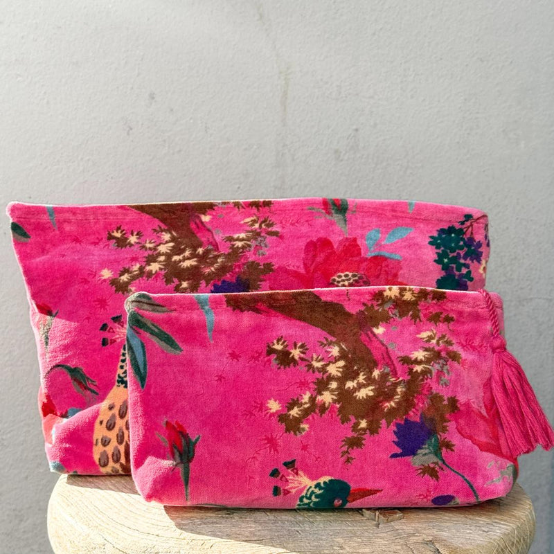 Denne fine toilettaske fra Annavii er håndlavet i Indien af velour med et fint mønster af blomster og fugle. Toilettasken har en fin dusk i lynlåsen og har blot et stort rum.