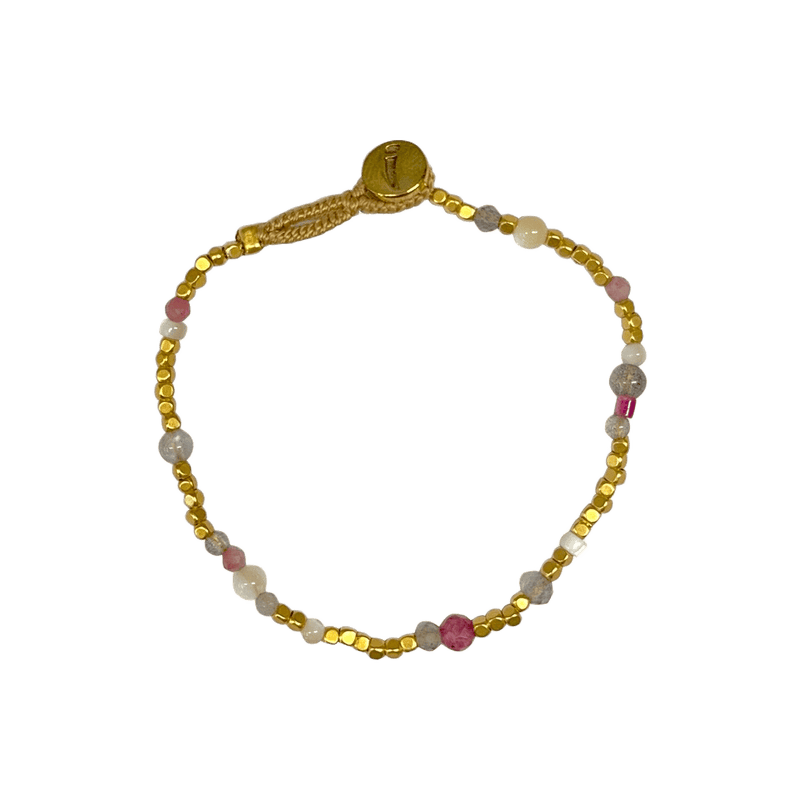 Joanie Mix armbåndet fra IBU Jewels er et elegant og tidløst smykke med et strejf af farve. Det består af gyldne perler kombineret med enkelte halvædelsten, der skaber et raffineret og afbalanceret udtryk. Armbåndet er håndlavet med sans for detaljen og kan bæres alene for et klassisk look eller mixes med andre IBU armbånd for et mere afslappet og personligt bohemelook. Et alsidigt smykke, der følger dig gennem alle sæsoner.