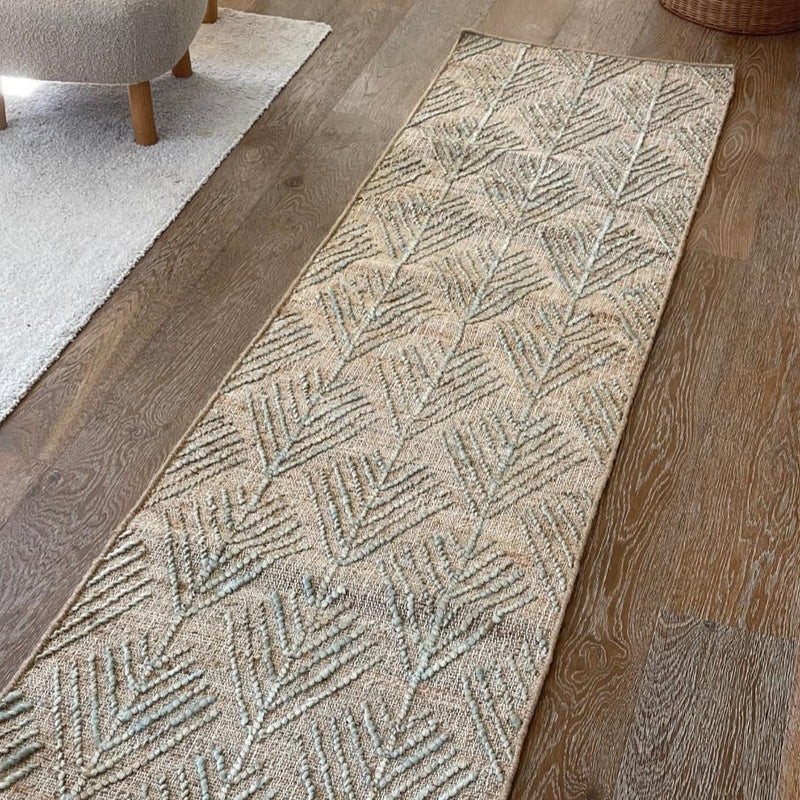 Tæppet er bl.a. lavet i jute, som er et fantastisk naturfiberprodukt og som med det samme giver et rum en dejlig varm atmosfære. Farven er beige med en grønlig mønster.