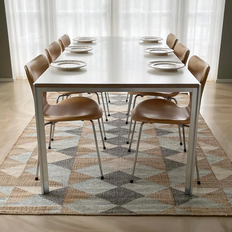 Tæppet er bl.a. lavet i jute, som er et fantastisk naturfiberprodukt og som med det samme giver et rum en dejlig varm atmosfære. Farven i et fint trekantet mønster med farver, der er beige, blå, hvid og lyseblå.