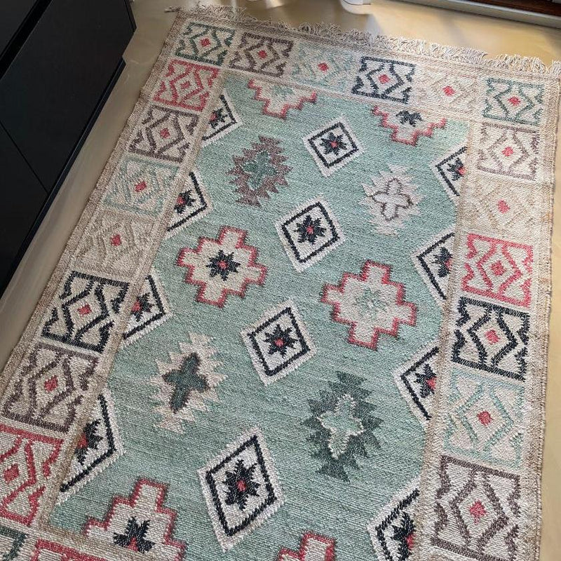 Tæppet er bl.a. lavet i jute, som er et fantastisk naturfiberprodukt og som med det samme giver et rum en dejlig varm atmosfære. Farven er beige med mønster i farverne grøn, rød og grå/sort.
