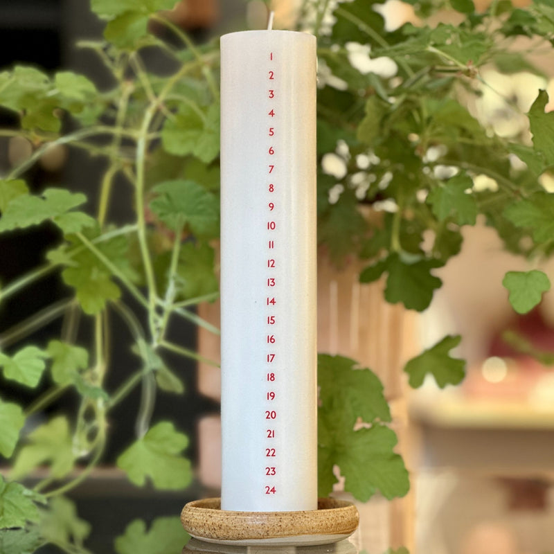 Skab varme og julestemning med kalenderlyset fra Åbenlys. Det enkle bloklys har et klassisk udtryk og brænder smukt med sin rolige flamme.
