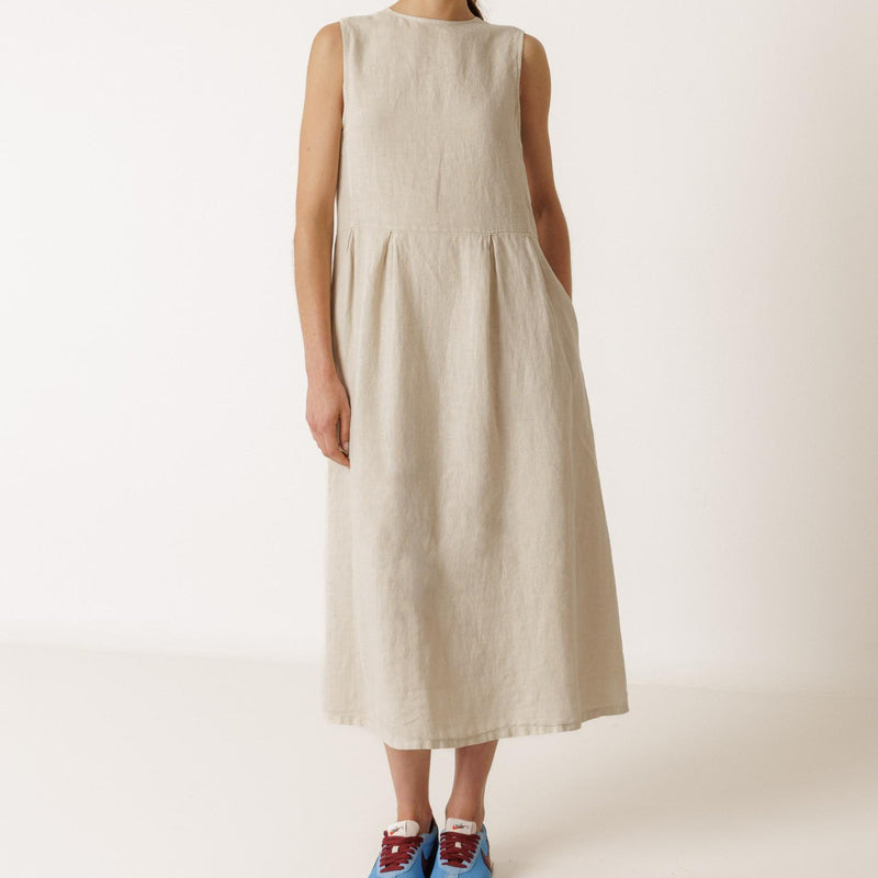 Denne ærmeløse kjole i hør fra Indi&Cold er skabt til en rolig og afslappet hverdag. Med sit enkle snit, lette materiale og feminine udtryk er det en kjole, du nemt kan bruge igen og igen – uanset sæson.Kjolen er vendbar, og du får derfor to forskellige udtryk i én kjole.
