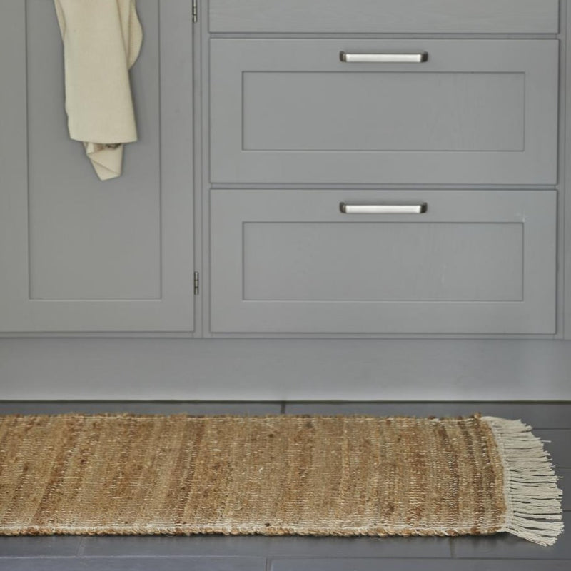 Denne fine gulvløber fra Ib Laursen er det perfekte tæppe i en lang gang eller i køkkenet. Det er lavet i jute og bomuld, og har hvide frynser i begge ender.