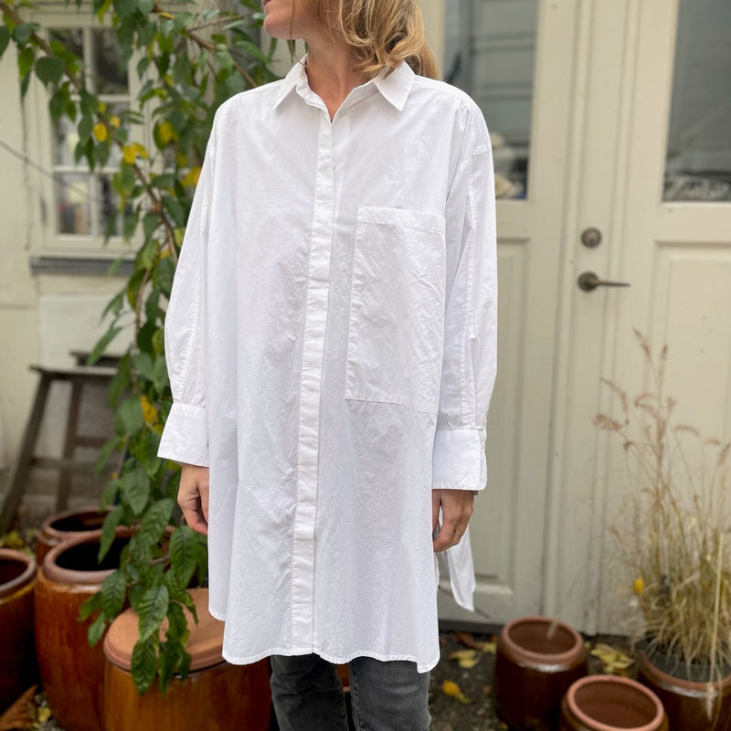 Skjorten er gennemknappet, og er lavet i en let bomuldspoplin, som gør den åndbar og super behagelig at have på. Modellen er onesize, som gør den vil sidde forskelligt fra person til person, men passer størrelser fra 34-44.