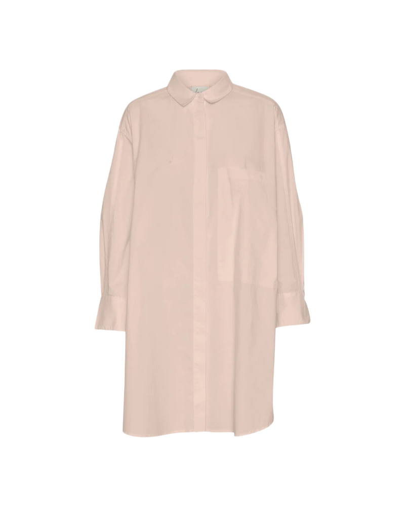 Lyon er en lang oversized skjorte i en sart lyserød tone fra det danske mærke Frau, perfekt til hverdagsbrug. Skjorten er længere bagpå med en rundet forkant, der giver et moderne og afslappet look.