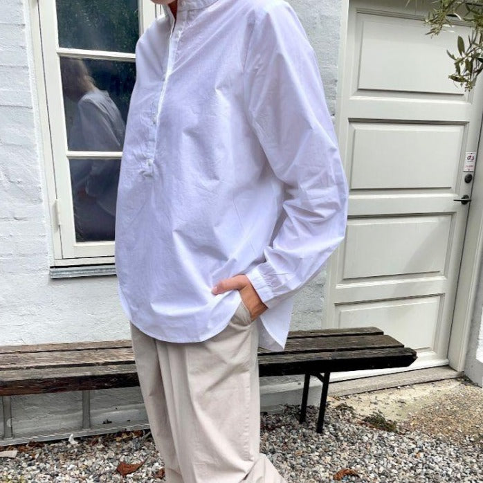 Skjorten har stolpelukning, og er lavet i en let bomuldspoplin, som gør skjorten åndbar og super behagelig at have på. Modellen er one size, som gør den vil sidde forskelligt fra person til person, men passer størrelser fra 34-44.
