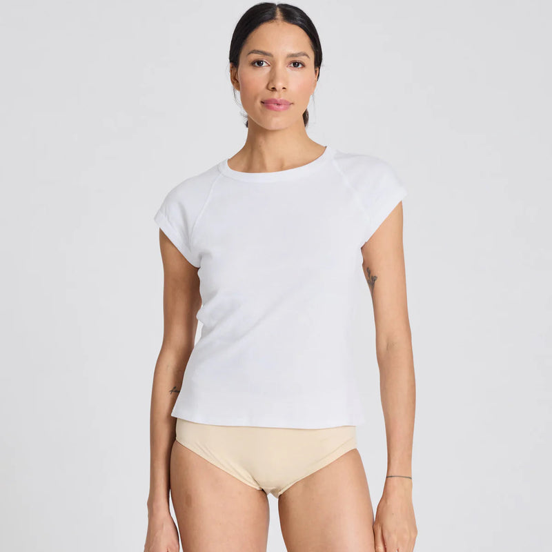 Malou er en kortærmet t-shirt, som er lavet af 100% økologisk bomuld. T-shirten har raglanærmer, let bådhalsudskæring samt ribkanter på halsudskæring og ærmer. Malou har en tætsiddende pasform.